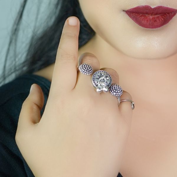 Our Oxidised Finger Rings are timeless accessories that blend rustic charm with bold style. Designed with an antique silver-tone finish, these rings are perfect for adding a traditional yet contemporary touch to your festive and everyday looks.