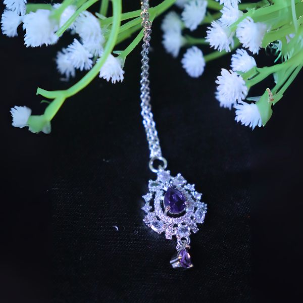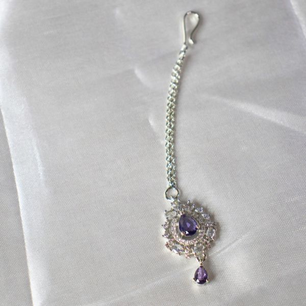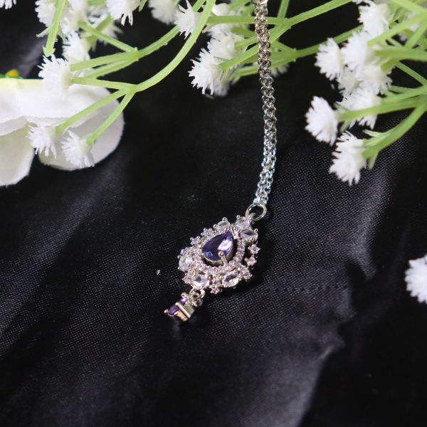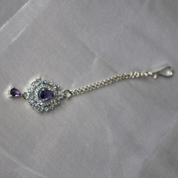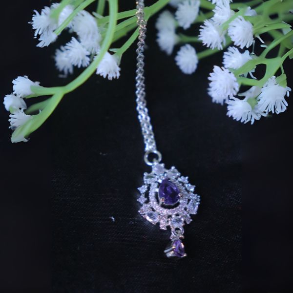 An AD Maang Tikka is a traditional Indian forehead ornament designed with American Diamonds (AD stones)—sparkling, diamond-like crystals that mimic the brilliance of real diamonds. These stones are set on a durable base of brass or copper and finished with high-quality plating for a glamorous look.