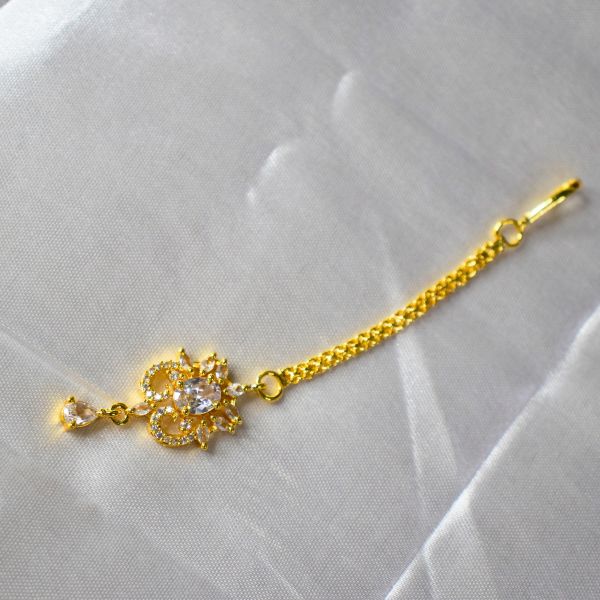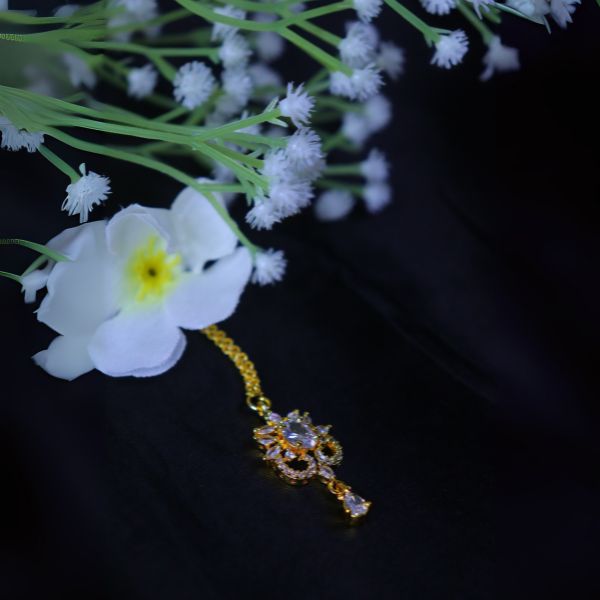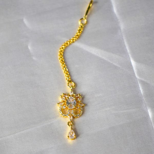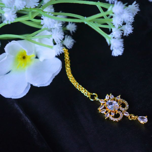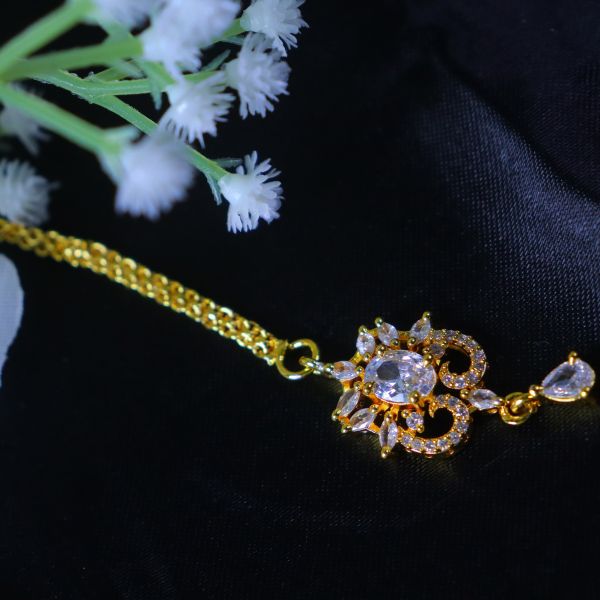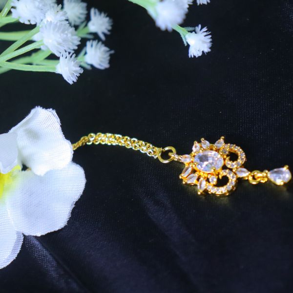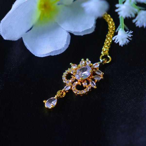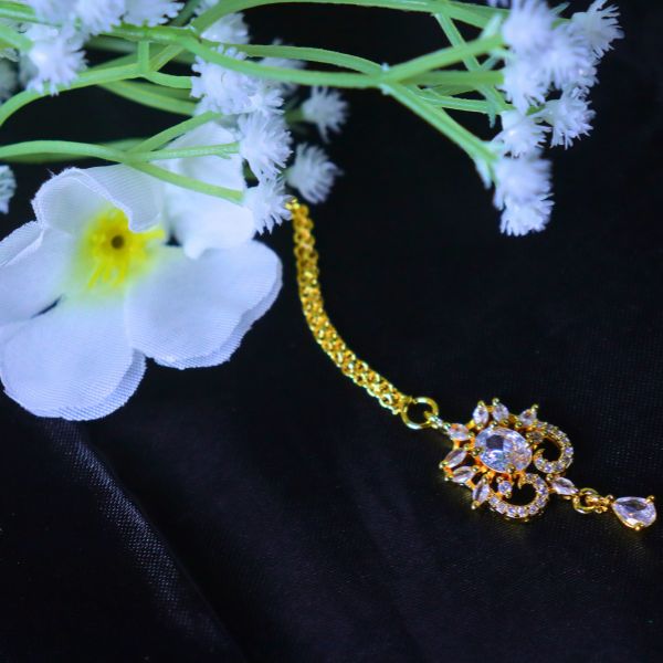 An AD Maang Tikka is a traditional Indian forehead ornament designed with American Diamonds (AD stones)—sparkling, diamond-like crystals that mimic the brilliance of real diamonds. These stones are set on a durable base of brass or copper and finished with high-quality plating for a glamorous look.