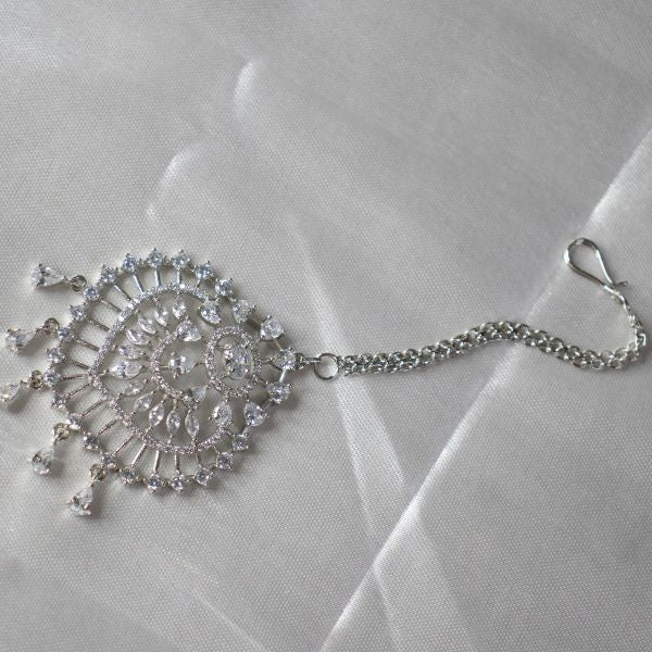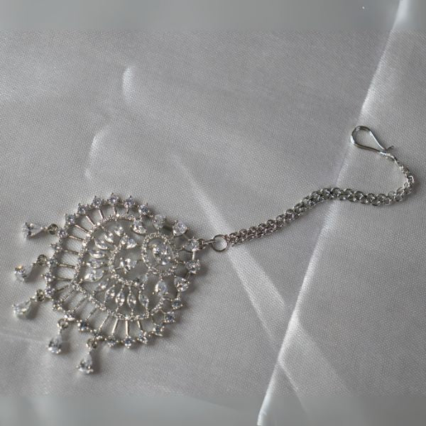 An AD Maang Tikka is a traditional Indian forehead ornament designed with American Diamonds (AD stones)—sparkling, diamond-like crystals that mimic the brilliance of real diamonds. These stones are set on a durable base of brass or copper and finished with high-quality plating for a glamorous look.